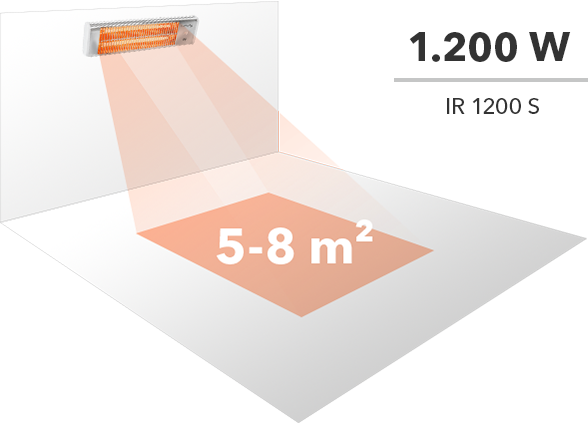 IR 1200 S ima dva stepena grejanja snage 600 W i 1.200 W pri čemu već niži stepen ima upečatljiv rezultat topline. Grejalicom se rukuje jednostavno sa ugrađenim poteznim prekidačem. Iako je infracrvena električna grejalica predviđena za zidnu montažu, može se zakrenutiza 60° za precizno tačkasto usmeravanje strujanja toplote.