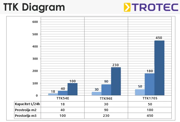 Profesionalni uređaji odvlaživaći vazduha TTK serije štede i do 80% vremena, suše kvalitetno i osiguravaju bolji i zdraviji prostor jer uništavaju bakterije i sprečavaju nastanka buđi. Kada govorimo o uštedi vremena važno je napomenuti da se ušteda odnosi na period prirodnog sušenja koje traje i po nekoliko meseci tako da se sušenje profesionalnim odvlaživačima vazduha TTK serije svodi na period od nekoliko nedelja a ne nikako na nekoliko dana. Prostorije koje sušite profesionalnim uređajima držite zatvorenim da bi izvlačili samo vlagu iz vaših zidova a ne i iz okoline.