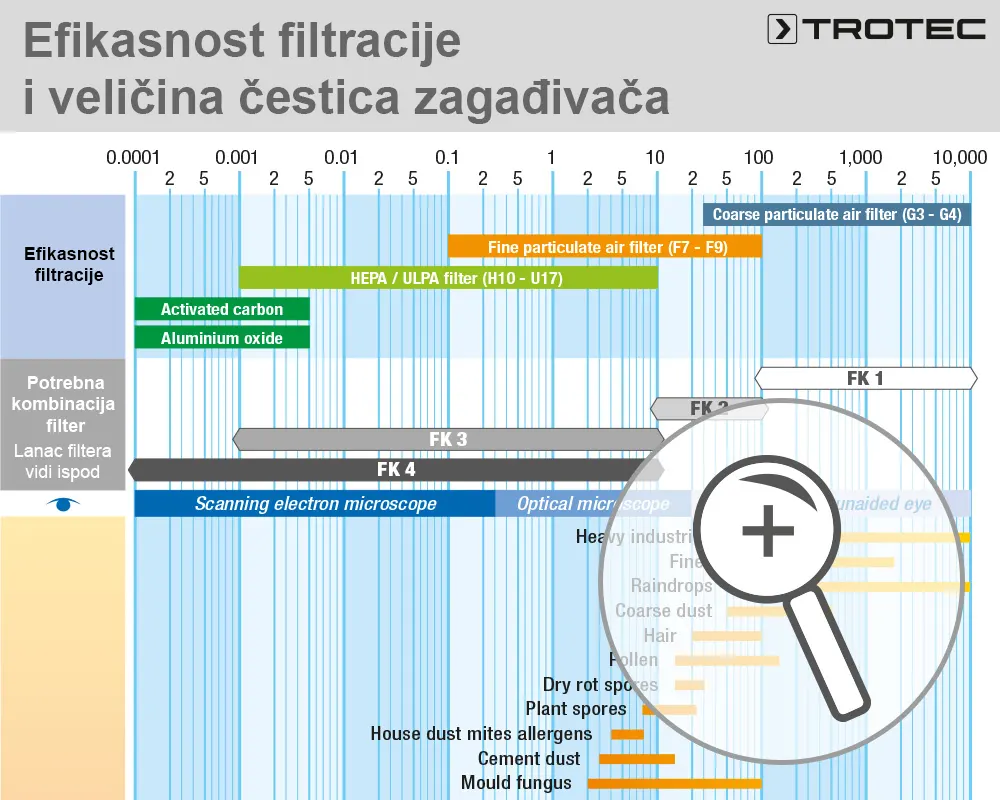 Čestice zagađivača u vazduhu mogu se klasifikovati prema njihovoj veličini. Dijagram pokazuje praktički orijentisan pregled koje efikasnosti filtracije i kombinacije filtera se moraju koristiti za koje nivoe kontaminacije vazduha u prostoriji.