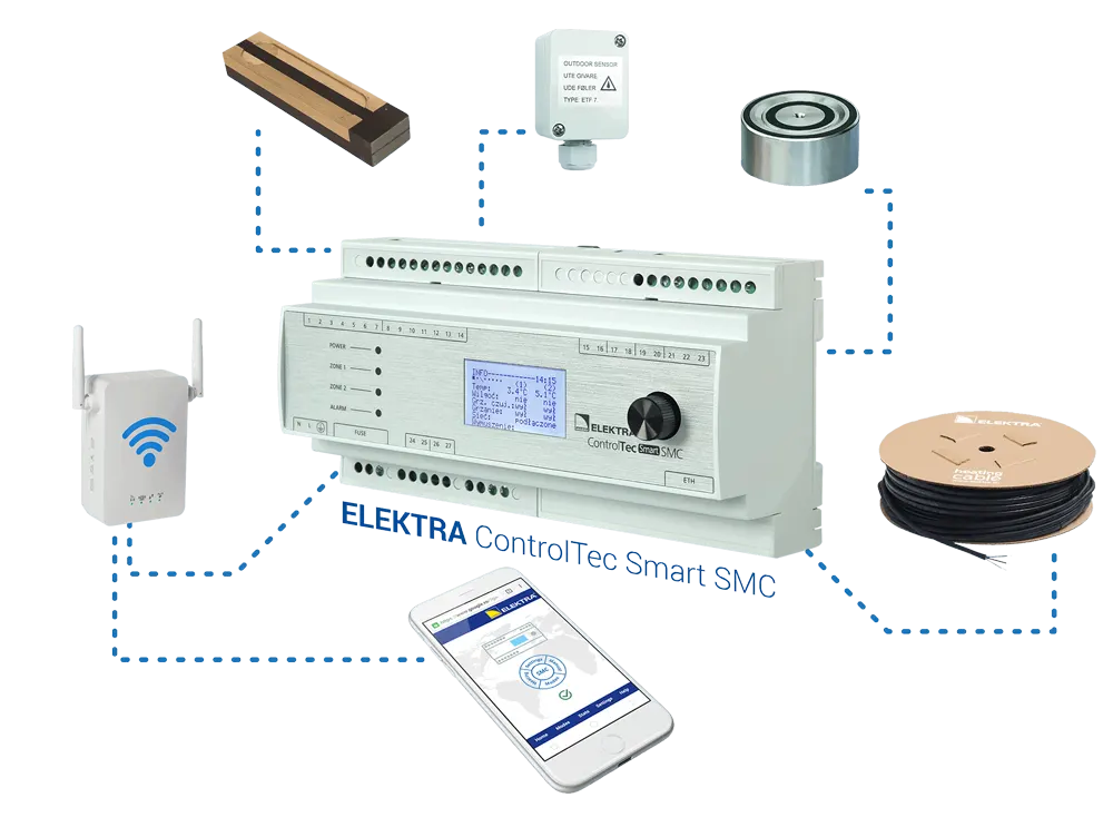 Elektronski kontroler temperature ELEKTRA Smart SMC konstruisan je specijalno za upravljane električnim sistemima grejanja za zaštitu od snega i leda. Upravlajnje sistemima je potpuno automatsko na osnovu podešenih parametara. Upravljanje i podešavanje parametara može se vršiti lokalno na kontroleru ili put web aplikacije sa mobilnog telefona, PC računara ili tableta. Proizveden u skladu sa standardima EN 60730-1 i EN 60730-2-9. On se sastoji od kontrolera, podnog senzora za vlagu i senzora temperature vazduha ili od kontrolera, senzora za vlagu u olucima i senzora temperature vazduha, u zavisnosti od primene.