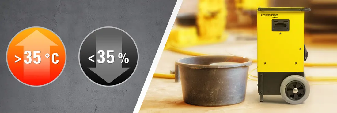 Na kraju krajeva, procesni vazduh korišćenih izolacionih sušara ima značajnu odgovornost za zagrevanje sobne temperature – bez obzira na model ili proizvođača. Zbog toga, Trotec turbo motori za sušenje izolacije dolaze opremljeni termičkom zaštitom koja automatski isključuje uređaje na pribl. 40 do 45 °C u zavisnosti od klimatskih uslova. Kube+ je takođe opremljen funkcijom termičke zaštite zasnovanom na senzoru, koja prebacuje uređaj na nivo 1 u slučaju neposrednog pregrevanja, a zatim se vraća u normalan rad ili u isključeno stanje u zavisnosti od temperaturnog profila. Ova zaštita ne samo da značajno produžava životni vek vaših izolacionih sušara i odvlaživača, već i sprečava termička oštećenja materijala koji se nalaze u prostoriji i konstrukciji zgrade.